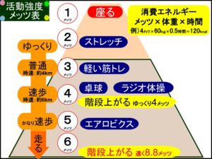 普通歩行(3メッツ)より強度の高い階段上り運動(4~8メッツ)を行うことで、心臓や肺の
