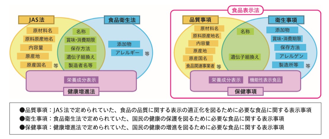 もともと食品表示は、食品衛生法、JAS法、健康増進法の3つの法律でそれぞれ定めがありました。この3つの法律の食品表示に関わる部分を1つにまとめ、事業者から消費者まですべての人が分かりやすい制度を目指して作られたのが食品表示法です。(2015年4月1日施行)